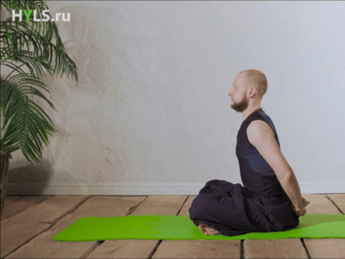 Примите позу со скрещенными ногами (по-турецки). Заведите обе руки за спину и обхватите левое запястье правой рукой. На выдохе наклонитесь вперёд и коснитесь пола лбом и носом. Задержитесь в таком положении на 8 секунд, затем, вдыхая, вернитесь в исходное положение. Выполните 8 раз.
