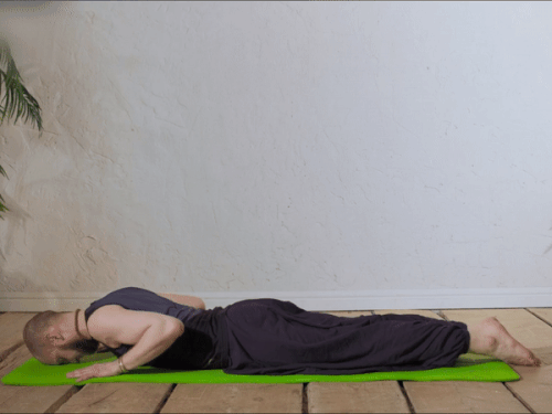 Лягте на пол животом вниз, грудь прижата к полу. Поддерживая вес тела на ладонях, поднимите грудную клетку и запрокиньте голову назад. Смотрите на потолок. Поднимаясь, делайте вдох, в верхней точке задержите дыхание на 8 секунд. Выдыхая, вернитесь в исходное положение. Выполните 8 раз.